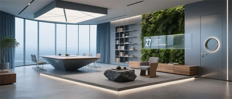 本項目以“未來生態(tài)辦公”為核心理念,打造1200㎡科技與自然交融的創(chuàng)新型辦公空間。設(shè)計采用啞光太空灰為主基調(diào),通過霧霾藍(lán)企業(yè)色原木紋理的碰撞,在冷峻科技感中注入人文溫度??臻g以微水泥地面為基底,貫穿透光亞克力陽極氧化鋁材質(zhì),配合隱藏式線性燈帶的流動光影,構(gòu)建出具有呼吸感的數(shù)字美學(xué)場域。