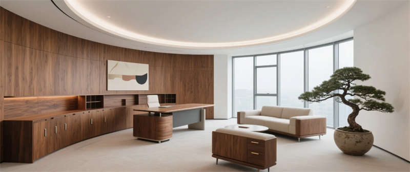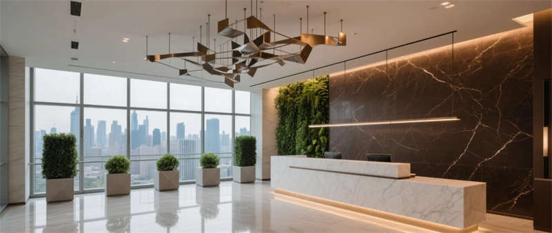以低飽和度色系為視覺(jué)基底,現(xiàn)代極簡(jiǎn)主義與自然生態(tài)理念在此交融,構(gòu)建兼具理性效率與情感溫度的辦公場(chǎng)域。通透的玻璃幕墻將城市天際線引入室內(nèi),前廳接待區(qū)以深褐大理石與抽象金屬裝置傳遞企業(yè)質(zhì)感,垂直綠植墻模糊建筑與自然的邊界。開(kāi)放式辦公區(qū)以模塊化家具與弧形書架創(chuàng)造靈活動(dòng)線,透明天窗將日光轉(zhuǎn)化為流動(dòng)的創(chuàng)作能量,幾何聲學(xué)板在靜謐中守護(hù)協(xié)作靈感。