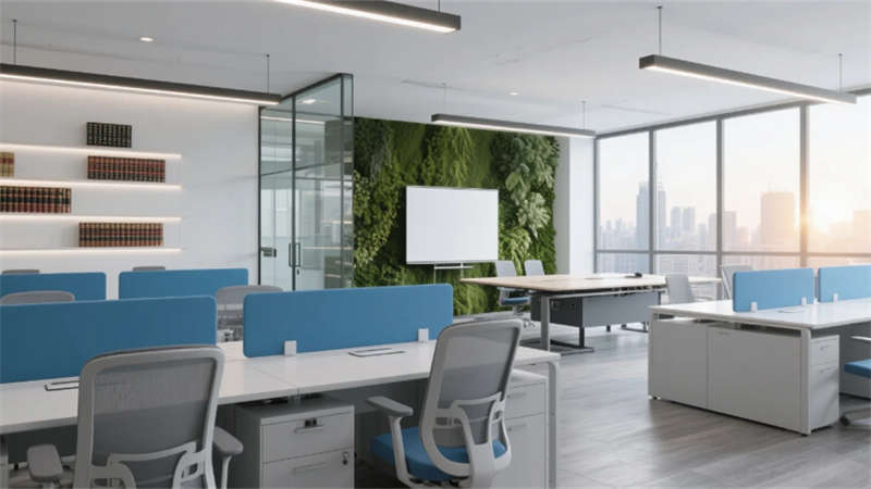 入口處弧形接待臺似律法天平,發(fā)光企業(yè)標(biāo)識懸浮于透光大理石背景墻,線性燈光如正義之軌延伸至開放式辦公區(qū)。玻璃幕墻外合肥城市天際線成為動態(tài)畫布,智能升降桌與模塊化工位詮釋高效協(xié)作。合伙人辦公室的270°環(huán)景視野,將巢湖煙波與都市繁華收于案頭,霧化玻璃在私密與開放間自由切換。