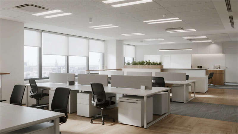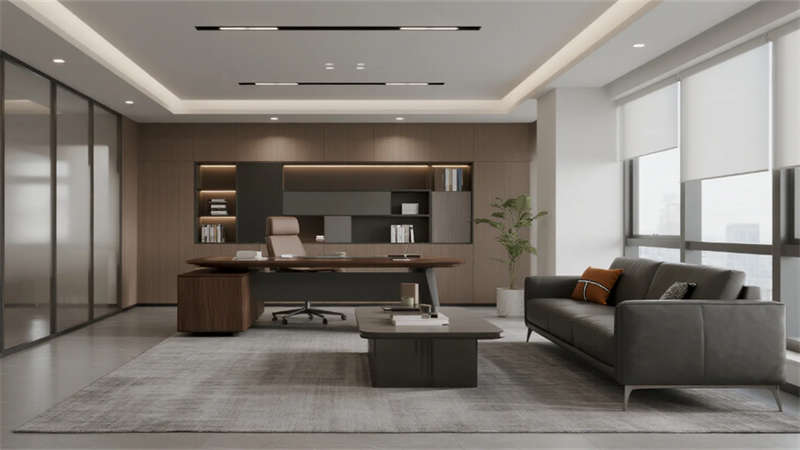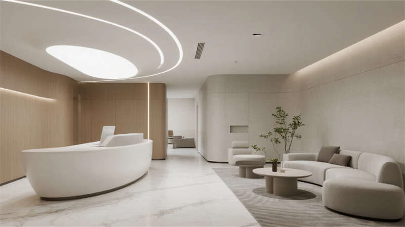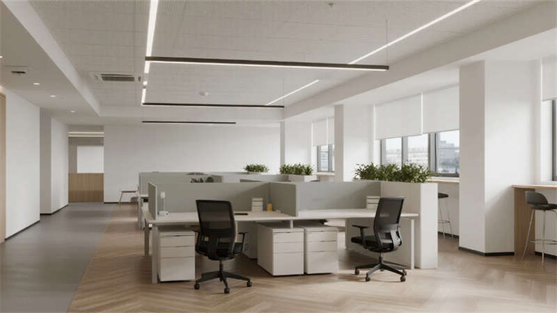 內(nèi)部空間延續(xù)外部的純凈氣質(zhì)。企業(yè)大堂以淺白色大理石地面與溫潤(rùn)木紋墻面奠定基調(diào),弧形純白前臺(tái)點(diǎn)綴深藍(lán)企業(yè)標(biāo)識(shí),懸浮線性燈光延伸視覺(jué)。右側(cè)等候區(qū)模塊化沙發(fā)與綠植盆景營(yíng)造舒適氛圍,左側(cè)數(shù)字影像墻動(dòng)態(tài)展示企業(yè)風(fēng)采,淺灰肌理漆背景墻在隱藏?zé)魩в骋r下更顯質(zhì)感。開(kāi)放式辦公區(qū)強(qiáng)調(diào)高效與靈活,白色穿孔吸音天花下,淺灰可升降桌與黑色人體工學(xué)椅組合排列,協(xié)作島與窗邊高吧臺(tái)滿足多元需求,淺木紋PVC地面增添自然暖意。高管辦公室運(yùn)用灰玻隔斷與電動(dòng)霧化膜保障私密,胡桃木辦公桌、深灰皮質(zhì)沙發(fā)與嵌入式書(shū)柜彰顯沉穩(wěn),無(wú)主燈設(shè)計(jì)營(yíng)造專(zhuān)注氛圍。公共支持區(qū)模塊化吧臺(tái)、淺木紋儲(chǔ)物柜與智能文件柜集成高效服務(wù),細(xì)節(jié)處的綠植點(diǎn)綴延續(xù)生態(tài)關(guān)懷。整體設(shè)計(jì)從外至內(nèi),以統(tǒng)一的色調(diào)、考究的材質(zhì)與智能化細(xì)節(jié),塑造出體現(xiàn)合肥創(chuàng)新精神的智慧辦公新標(biāo)桿。