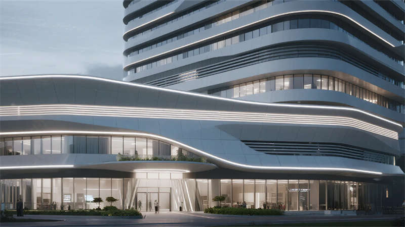 本設(shè)計(jì)呈現(xiàn)一處現(xiàn)代企業(yè)總部空間,將科技感、生態(tài)理念與極簡(jiǎn)美學(xué)完美融合。建筑外立面以銀灰與淺白為主調(diào),標(biāo)志性的流線型玻璃幕墻反射柔和天光,橫向啞光金屬線條勾勒出精致輪廓。主入口挑高設(shè)計(jì)配以通透落地玻璃,底部巧妙融入垂直綠植墻或淺灰色光伏玻璃,日間展現(xiàn)科技冷靜,夜間透出均勻溫暖光暈,周邊簡(jiǎn)潔綠植景觀呼應(yīng)生態(tài)主題。