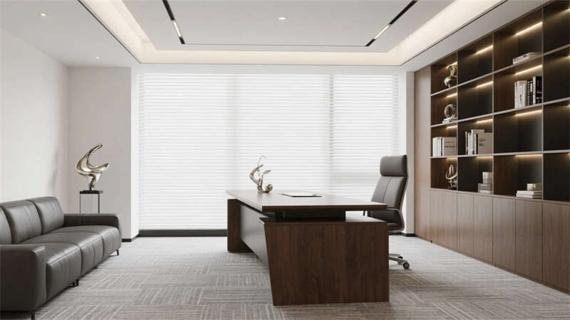 核心區(qū)域聚焦功能與美學(xué)的平衡:前臺(tái)木格柵墻以線性燈光延展空間縱深感;開(kāi)放式工位區(qū)通過(guò)綠植與幾何畫(huà)作注入生機(jī);獨(dú)立辦公室運(yùn)用胡桃木與皮質(zhì)元素提升質(zhì)感,整墻書(shū)架成為智慧沉淀的象征。過(guò)渡空間被賦予多重價(jià)值——走廊生態(tài)墻引入自然呼吸,蛋形討論艙激發(fā)即興靈感,階梯圖書(shū)館則營(yíng)造沉思角落。