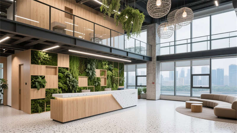 本項目以“自然滲透”與“靈活共生”為核心,將輕工業(yè)風的理性框架與生態(tài)綠意巧妙融合。空間打破傳統(tǒng)辦公割裂感,通過綠植墻體、透光天井與流動線條,在合肥城市肌理中營造出呼吸感十足的職場綠洲。