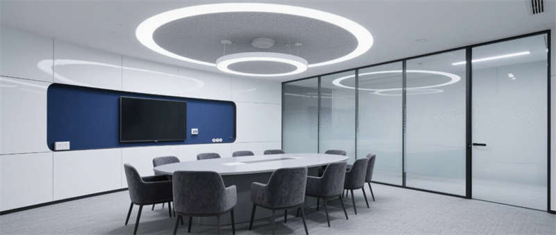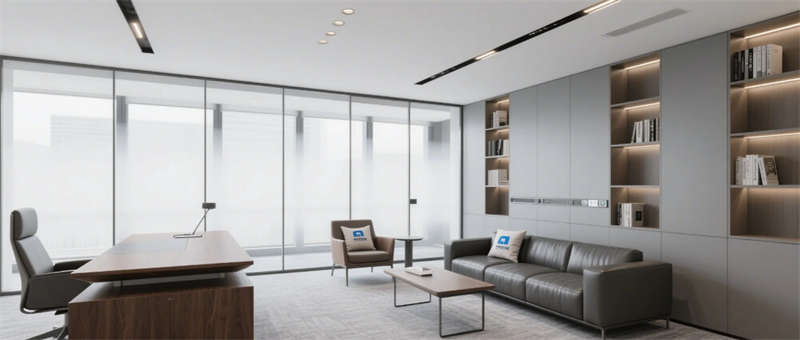 高管辦公室通過灰玻霧化膜實現(xiàn)私密與通透的辯證,胡桃木辦公桌與深灰沙發(fā)組演繹商務(wù)美學(xué),隱藏式智能控制系統(tǒng)將科技感融于無形??萍紩h室創(chuàng)新采用環(huán)形桌體與360°攝像系統(tǒng),陣列麥克風與補光燈帶打造沉浸式遠程協(xié)作場景。從光伏玻璃幕墻到模塊化綠植系統(tǒng),從智能升降辦公桌到節(jié)能設(shè)備集群,每個細節(jié)都銘刻著可持續(xù)發(fā)展的空間基因。