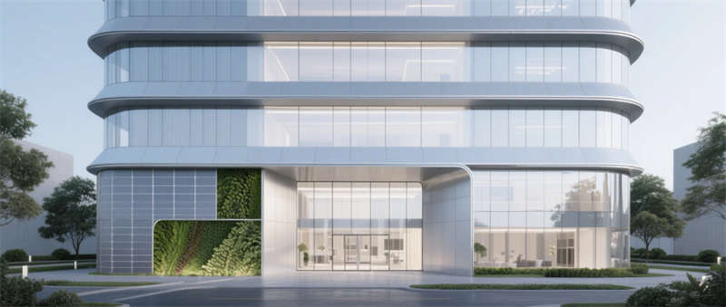 建筑外立面以流線型玻璃幕墻勾勒現(xiàn)代輪廓,啞光金屬橫向線條與淺灰光伏玻璃交織出科技韻律。主入口挑高10米的全景落地玻璃打破內(nèi)外界限,垂直綠植墻沿基座向上生長,銀灰主色調(diào)在日光下折射出柔和光暈,夜幕降臨時則化作通透的光之容器,實現(xiàn)科技感與生態(tài)理念的共生關(guān)系。