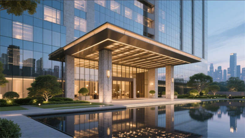 外觀設(shè)計(jì)以玻璃幕墻與天然石材的幾何拼接為視覺焦點(diǎn),日景通過景觀水池倒映建筑輪廓,夜晚則依托泛光照明凸顯立體層次,與城市天際線和諧共生。挑空兩層的大堂以金色流線吊燈與懸浮水晶樹藝術(shù)裝置為核心,大理石地面與弧形LED背光接待臺(tái)營造沉浸式抵達(dá)體驗(yàn),自然光與暖色燈光交織,傳遞低調(diào)奢華氣質(zhì)。