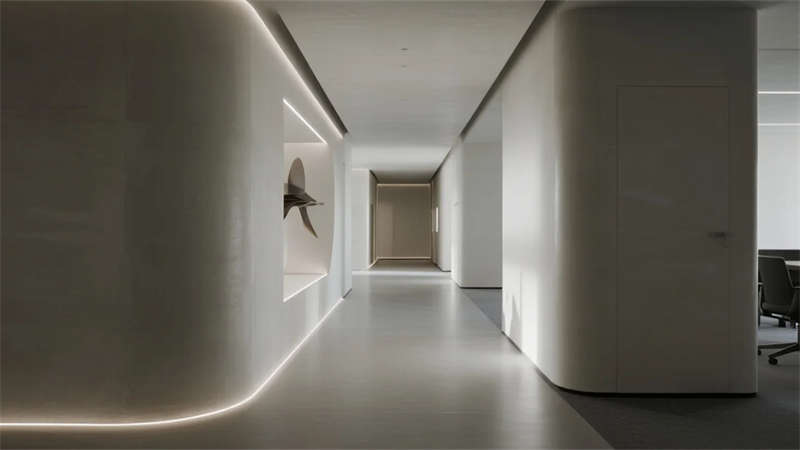 本設(shè)計以現(xiàn)代簡約語言重構(gòu)辦公展示空間,摒棄冗余裝飾,用微水泥的質(zhì)樸肌理與金屬的精致光澤形成對話。線性光帶貫穿空間,勾勒出清晰的建筑輪廓,同時營造輕盈的科技感。大量留白處理賦予空間呼吸感,使產(chǎn)品展示與人文辦公自然融合。玻璃隔斷的應(yīng)用模糊了功能區(qū)域的邊界,形成通透連續(xù)的視覺體驗。精心調(diào)配的自然光照與人工照明系統(tǒng),在不同時段呈現(xiàn)細(xì)膩的光影層次。軟裝選用低飽和度色調(diào),搭配溫潤木元素與綠植,平衡科技空間的冷靜感,最終打造出一個既體現(xiàn)專業(yè)氣質(zhì)又蘊(yùn)含人文溫度的現(xiàn)代辦公展廳。